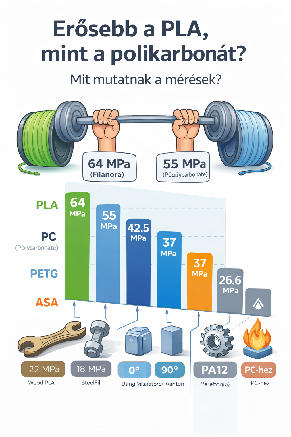 Igen, jól látod: a PLA szakítószilárdsága magasabb, mint a „műszaki nagyágyúnak” tartott polikarbonáté.